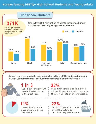 LGBTQIA+ youth experience higher rates of hunger due to food insecurity when compared to their non-LGBTQIA+ peers. While school meals are a reliable food source for millions of U.S. students, many LGBTQIA+ youth miss school because they feel unsafe or uncomfortable.