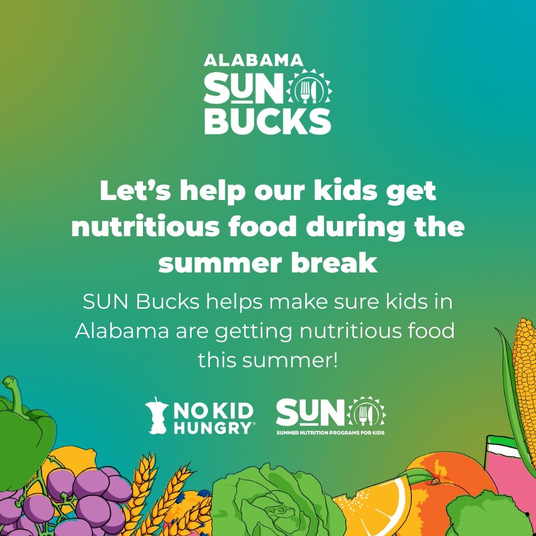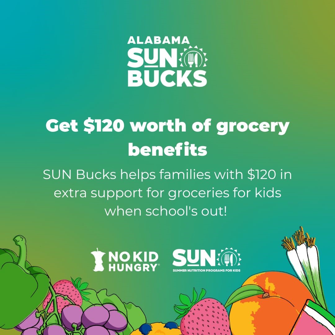 SUN Bucks helps families with $120 in extra support for groceries for kids when school's out! This important program is expected to help over 500,000 kids in Alabama get access to healthy food this summer!