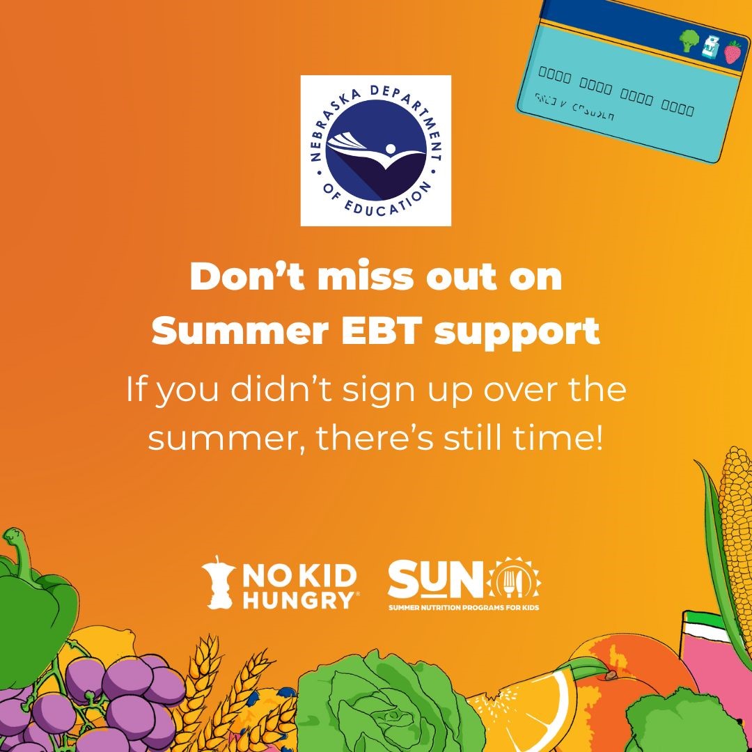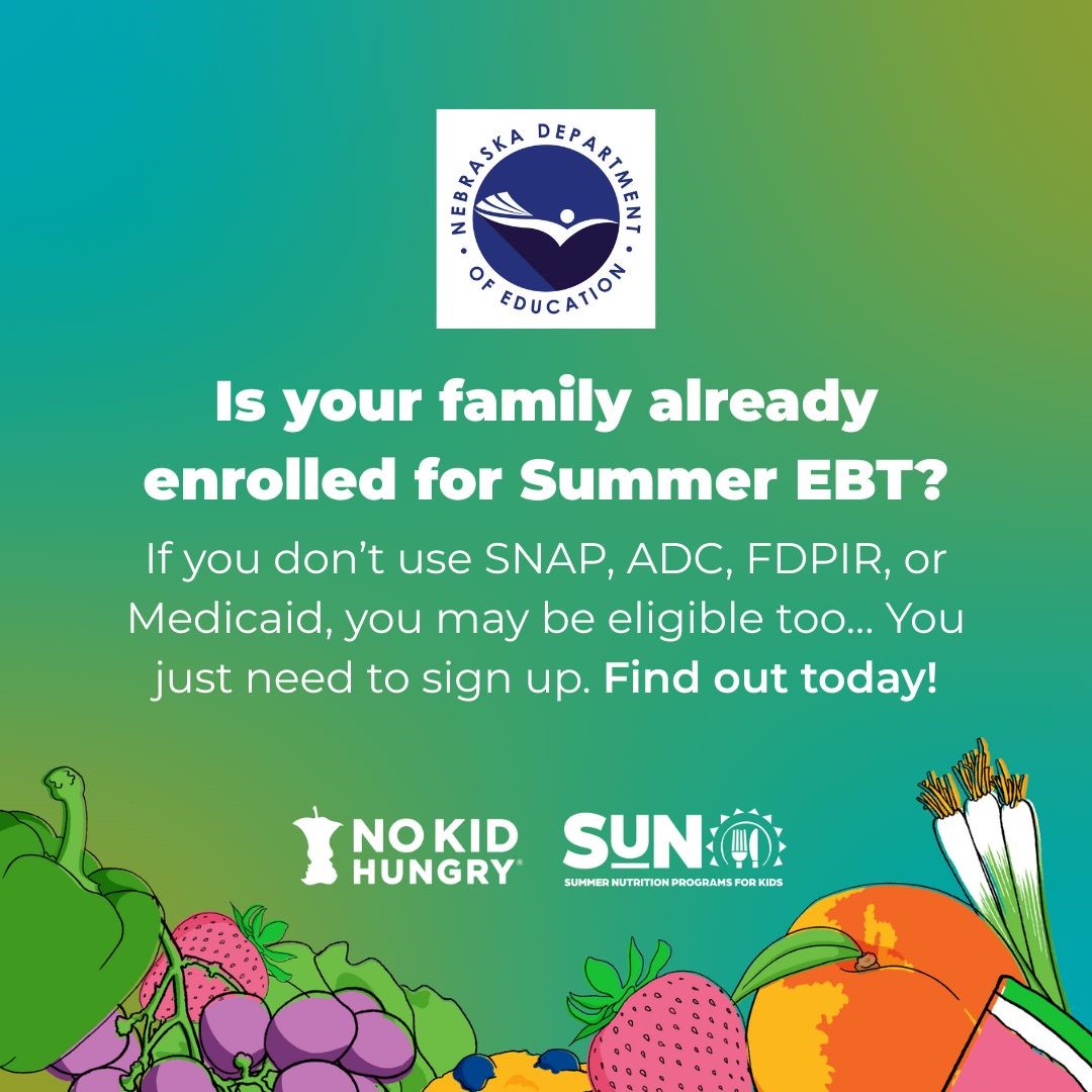 🍎 Si aún no has recibido ni te has inscrito para Summer EBT, ¡todavía estás a tiempo! Puedes averiguar tu elegibilidad en bit.ly/NE-SEBT-eligibilitychecker.
