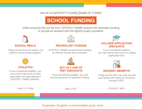 - Customizable English & Spanish language postcards, Facebook and Twitter graphics, and template FAQ flyers for outreach to families